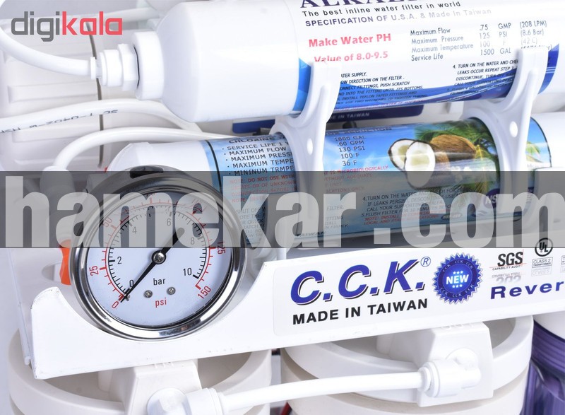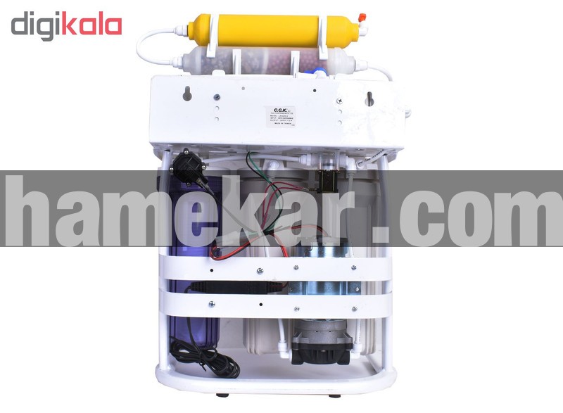 تصفیه آب سی سی کا اکسیژن ساز با سیستم تصفیه اسمز معکوس و قلیایی کننده در نوع خود بهترین دستگاه تصفیه آب خانگی به حساب می اید این دستگاه در 8 مرحله توسط8 فیلتر آب را تصفیه میکند این فیلترها شامل فیلتر های PP + UDF + CTO + MEMBRANE + POST CARBON + MINERAL + ORP + OX می باشد این دستگاه دارای مخزن ذخیره آب 16 لیتری _ فیلتر ممبران 13 لایه و هوزینگ های دوبل اورینگ برای آب بندی بهتر است فیلترهای این دستگاه کلیه ناخالصی های آب تا 0/0001 میکرون را جذب کرده و تا 99.99 درصد از ویروسهای اب را از بین می برد از مزایای دیگر این دستگاه پایین آوردن سختی آب(TDS) و نیترات و نیتریت و تنظیم PH آب است پمپ این دستگاه 125psi و بدون صدا و لرزش و با برق 24 ولت کار می کند اب خروجی این دستگاه خواص آنتی اکسیدانی (ضد سرطانی) و خواص قلیایی را دارد این دستگاه ساخت کشور تایوان _ تحت لیسانس آمریکا _ دارای استاندارد های جهانی FDA_WQ_CE_NSF می باشد