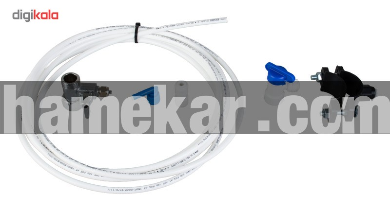 4- پکیج نصب دستگاه که شامل ، آچار مخصوص جدا کردن شیلنگ از اتصالات فیتینگ ، شیلنگ ، شیر آب مخزن ، شیر اتصال دستگاه به لوله آب زیر سینک ظرفشویی، قطعه اتصال شیر پیسوار به شیر ورود آب به دستگاه ، قطعه متصل کننده درین دستگاه به لوله فاضلاب زیر سینک ظرفشویی