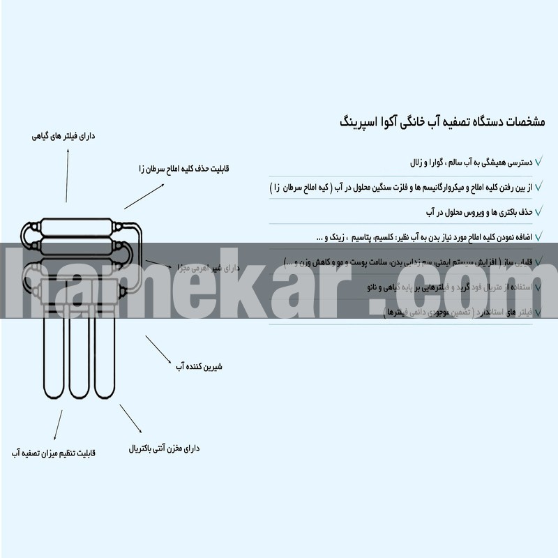 دستگاه فوق دارای ممبراین فیلمتک، شیر استیل مجزا، مخزن ذخیره مجزای آنتی باکتریال می باشد که از بهترین و معتبرترین دستگاه های ارائه شده در بازار است. کلیه محصولات نشانگر کیفیت و سلامت محصول اروپا را دارا می باشند و استانداردهای NSF – ISO – FDA – WATER QUALITY – CE را کسب نموده است.
