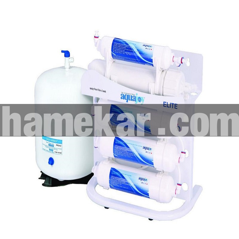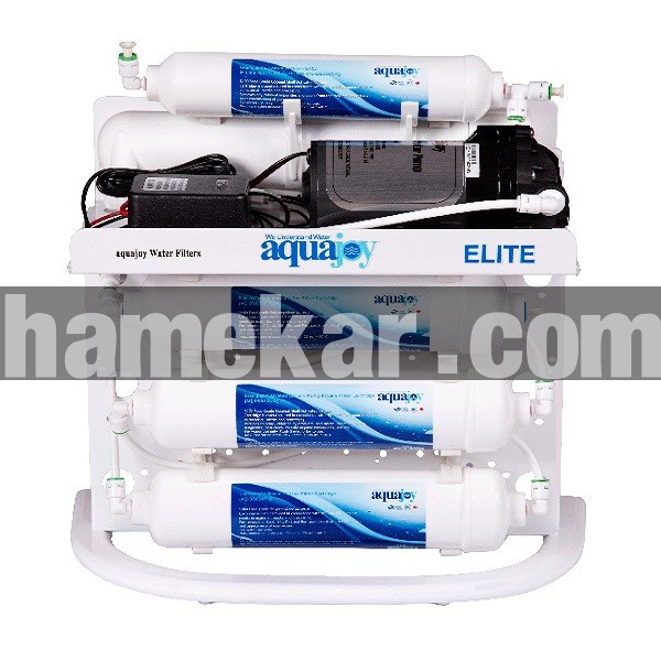 شرکت آکواجوی یکی از بهترین و معتبرترین شرکت های تصفیه آب نه تنها در ایران بلکه در سطح جهان می باشد. محصولات آکواجوی مونتاژ کشور تایوان و تحت لیسانس کانادا می باشد.دستگاه آکواجوی مدل الیت مطابق با تكنولوژي RO ( اسمز معكوس يا آب شيرين كن ) براي محل هايي كه آب ورودي داراي مقادير بيش از حد نرمال جامدات محلول مي باشد طراحي شده است.اين دستگاه علاوه بر حذف ذرات معلق، گازهاي شيميايي، تركيبات مضر موجود در آب (نظير نيترات، آرسنيك، فلزات سنگين و … ) ، قادر است كه سنگيني (TDS) و سختي (TH) آب را نيز تاحد قابل توجهي كاهش دهد.دستگاه تصفیه آب آکواجوی مدل Elite ، با توجه به دارا بودن پمپ تامين فشار ، برايمناطقي كه فشار آب ورودي كمتر از حد نرمال است نيز مناسب مي باشد. حد اكثر آب دهي اين دستگاه 8 ليتر در ساعت مي باشد كه جهت رفع نيازهاي يك خانواده كافي به نظر مي رسد. این دستگاه دارای منبع ذخیره تحت فشار با گنجایش 12 لیتر می باشد.لازم به ذكر است كه تفاوت اين دستگاه با دستگاه های تصفيه آب پنج مرحله اي معمولی،عبارتست از:فيلتر هاي اين دستگاه از نوع Inline و داراي اتصالاتي موسوم به QC يا اتصالات سريع هستند. اين موضوع باعث سهولت تعويض فيلتر هاي دستگاه مي شود. بدنه دستگاه به صورت پایه دار طراحی شده است و علاوه بر استحکام بیشتر، حفظ تعادل دستگاه نیز آسان تر شده است.