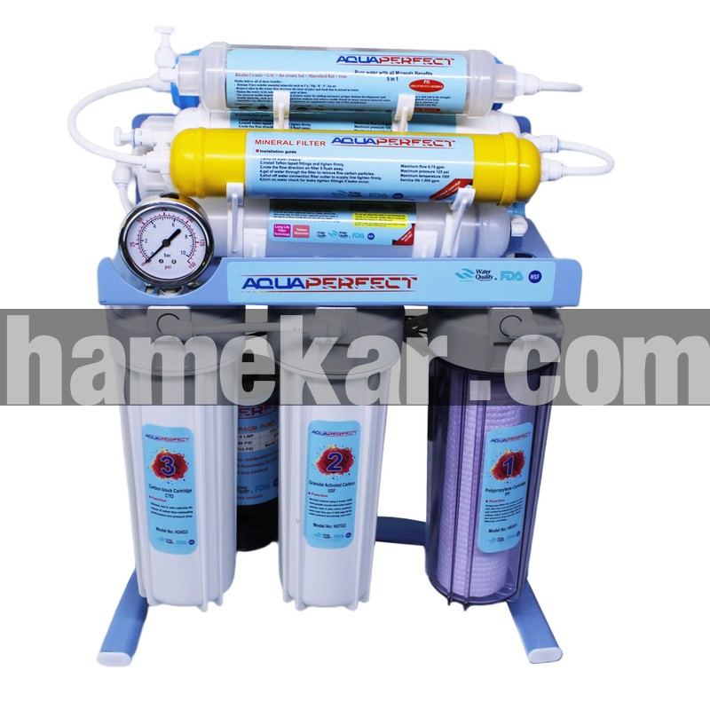 دستگاه تصفیه آب خانگی آکواپرفکت با رنگ آبی بسیار شیک در 13 مرحله و با 9 فیلتر مجزا ، تصفیه آب به صورت کامل انجام خواهد شد.