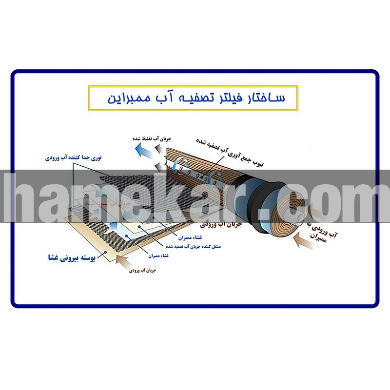 فیلتر ممبراین: تهیه شده از لایه های کامپوزیت 13 ساید که مهمترین و اصلی ترین فیلترهای دستگاه می باشد که از لحاظ فعالیت به عنوان قلب دستگاه وفیلتر اسمزمعکوس نامیده می شود.این فیلتر کلیه املاح مضر،نیترات و نیتریت و آرسینک و میکروارگانیسم و فلزات سنگین از جمله جیوه و سرب محلول در آب را تا ابعاد 001/0 میکرون به طور کامل از آب حذف می نماید . فیلتر ممبراین کلیۀ املاح و ترکیبات شیمیایی و املاح سرطانزا را پاکسازی می کند.